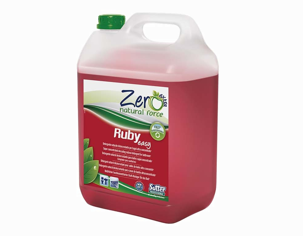 Detergente disincrostante super concentrato, a base di acido organico di origine naturale (acido citrico). Ideale per l’ambiente bagno. Indicato per la pulizia quotidiana di rubinetterie, vasche, doccia, piastrelle, ecc. L’utilizzo giornaliero di Ruby Easy, grazie agli agenti anti-ridepositanti, aiuta a prevenire la formazione di incrostazioni.